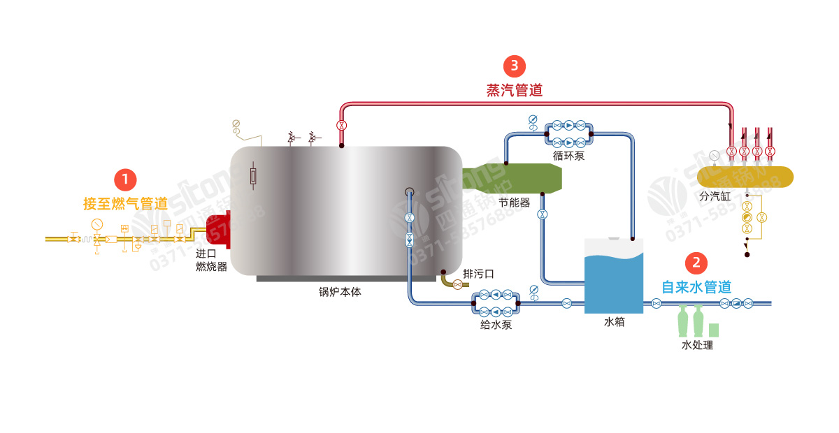 锅炉配备超低氮全自动燃烧机,使烟气有害污染物少,无噪音运行