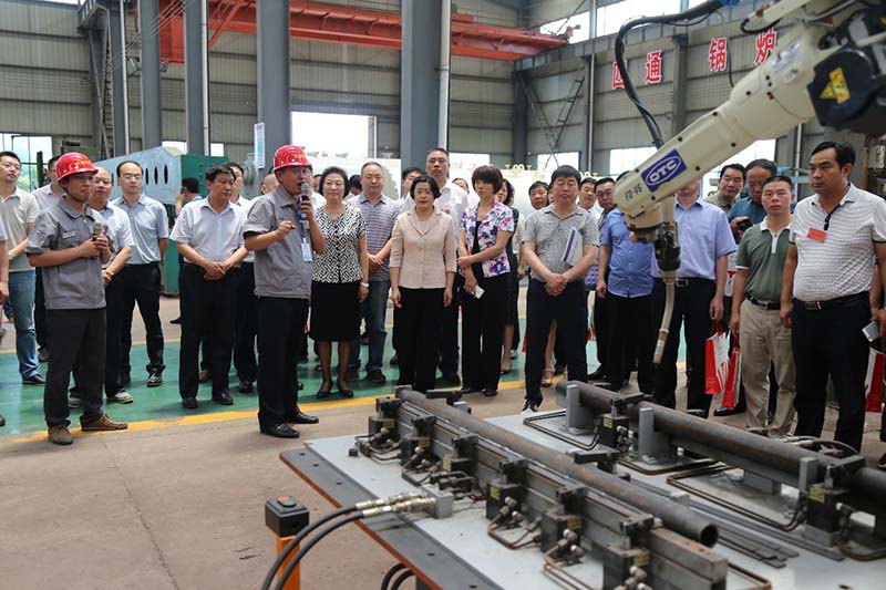 尤其以切割和焊接环节做了重点介绍,讲解现在四通在生产效率和质量把控上的利器------高科技生产设备,如德国三维激光切割机,日本OTC焊接机器人,美国海宝数控切割设备,瑞典卷板机等等,实现了部分生产环节的自动化和半自动化率,生产效率、生产质量成倍提升。有效的增加良品率的同时,极大的减少了售后成本。而这些高科技的生产设备的运用无疑是对国家产业升级和科技创新国策的强烈响应。从过去人工粗放式生产,到如今工业机器人的引入,迅速抬升了公司节能锅炉和环保锅炉等产品的科技含量。过去生产的笨重和体积巨大的传统锅炉产品,即将被更高效、更环保、更节能的贯流锅炉产品所替代。