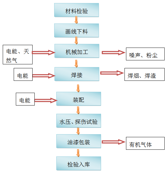 公司主要产品为燃煤锅炉、燃气锅炉,电加热锅炉三大类大中型锅炉,主要工艺流程及废弃物: