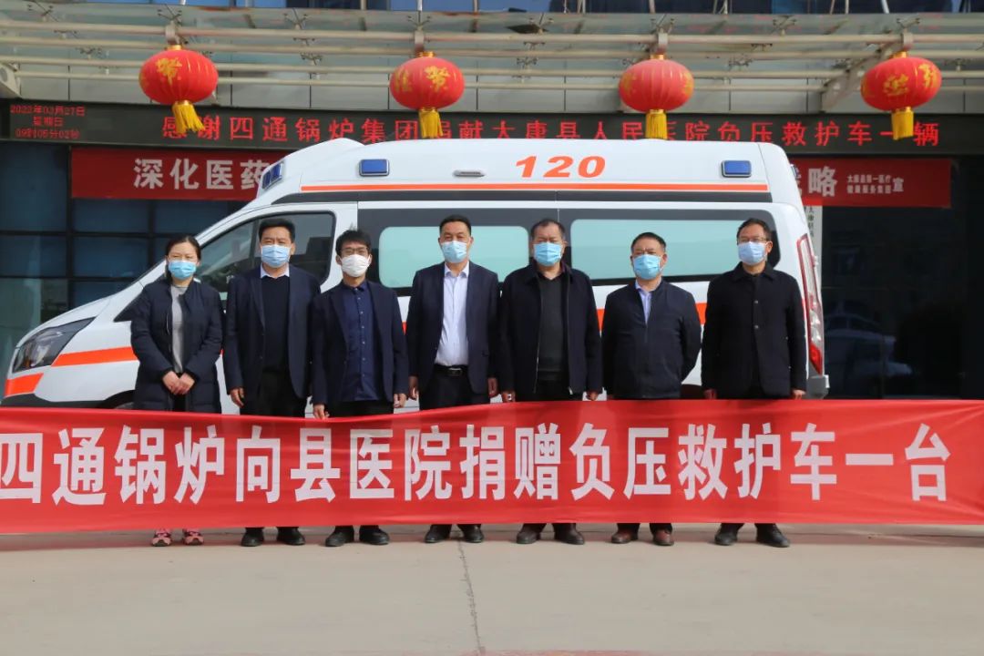 在疫情防控期间,四通锅炉勇担社会责任,克服重重困难捐献急需物品物资。3月22日疫情以来,向社会各界捐款、捐物累计价值50余万元(其中为太康县人民医院捐赠负压救护车一辆)。